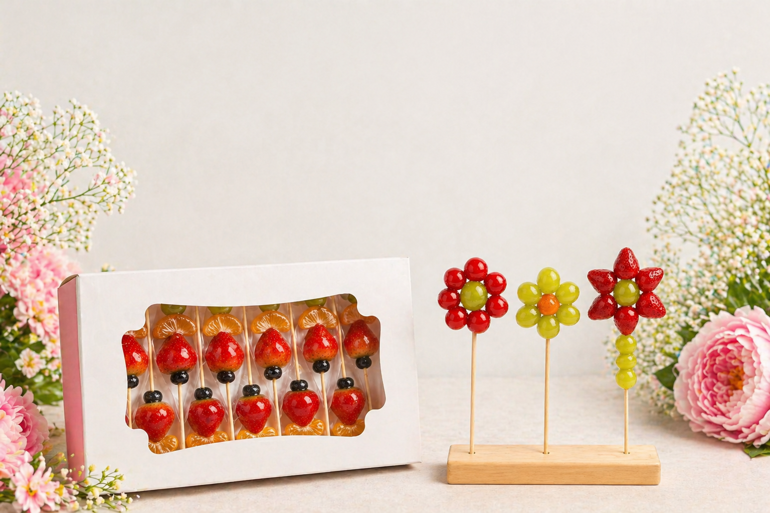 Handcrafted blossoms and gift boxes — fresh fruit, crystal glaze, and a presentation worth photographing.